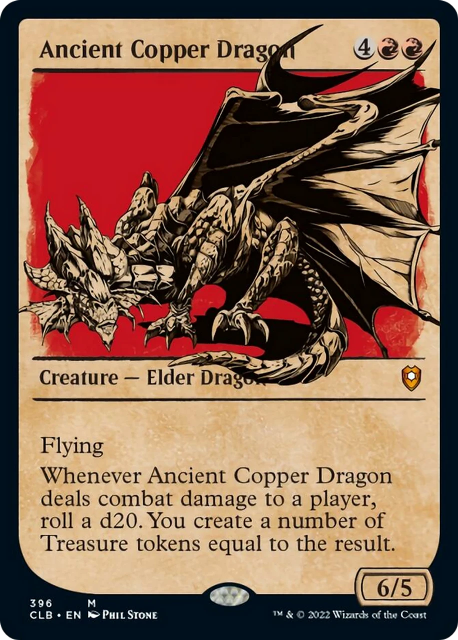 Whenever Ancient Copper Dragon deals combat damage to a player, roll a d20. You create a number of Treasure tokens equal to the result.