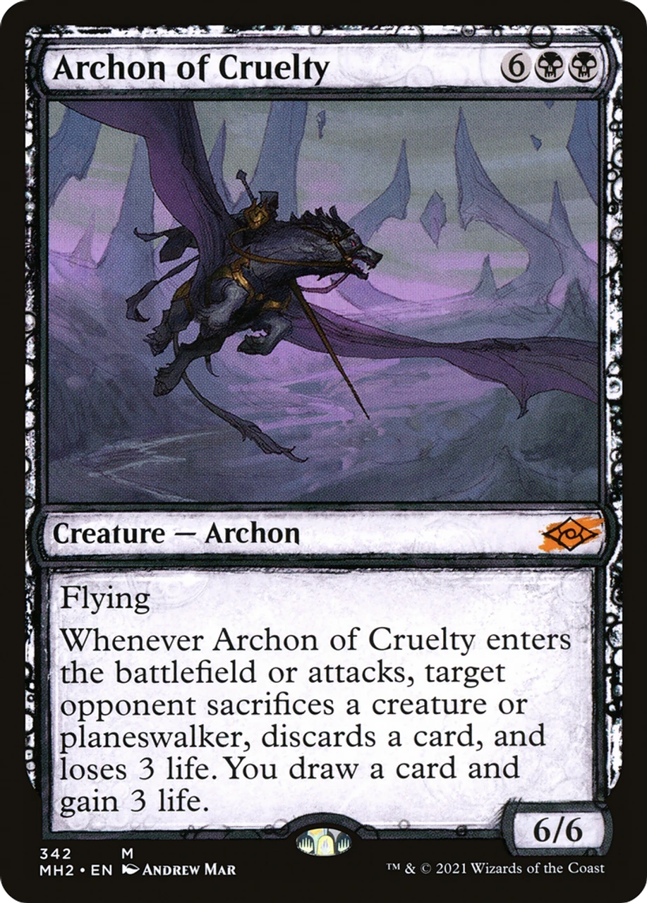 Whenever Archon of Cruelty enters the battlefield or attacks, target opponent sacrifices a creature or planeswalker, discards a card, and loses 3 life. You draw a card and gain 3 life.