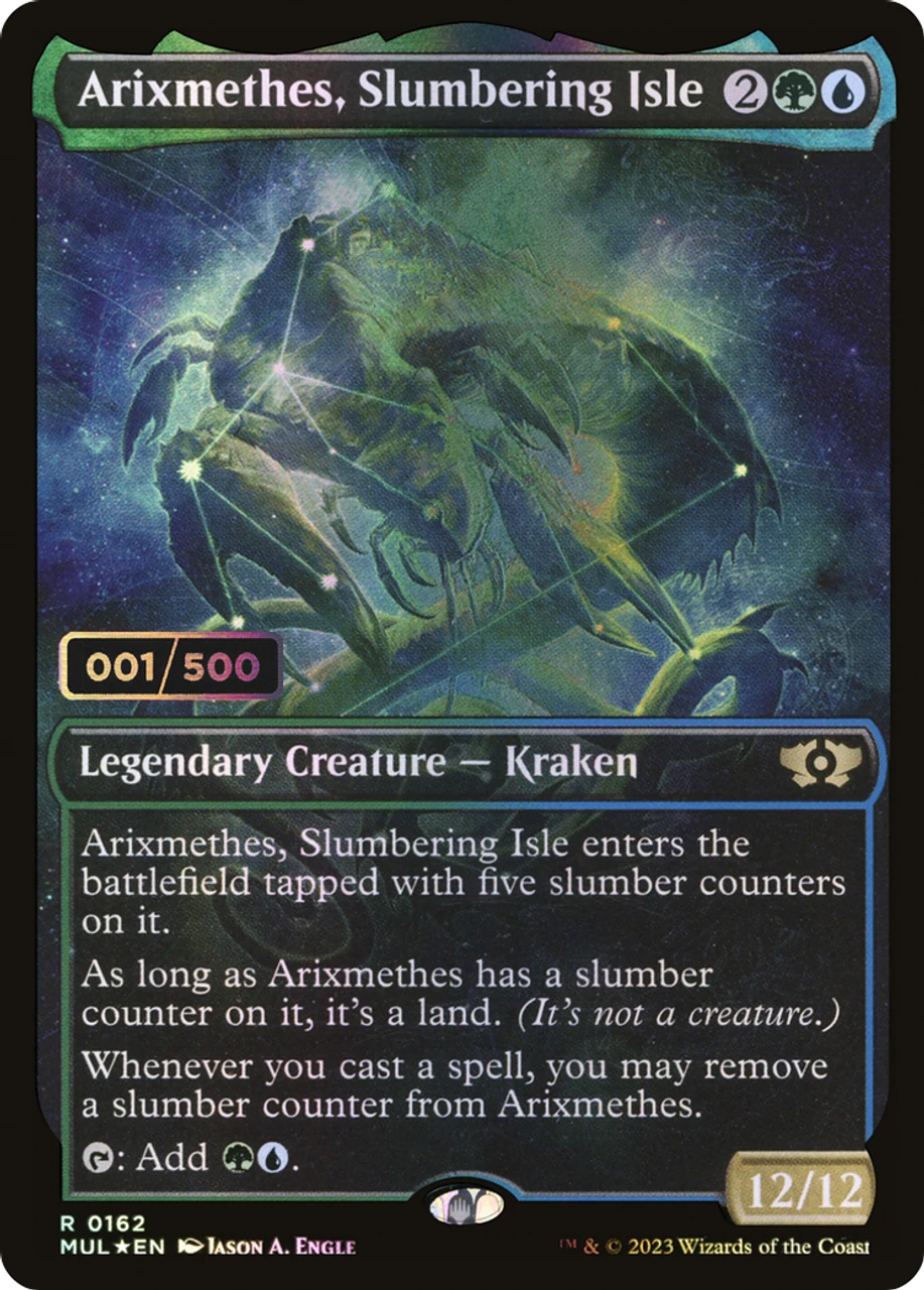 - Text: Arixmethes, Slumbering Isle enters the battlefield tapped with five slumber counters on it.