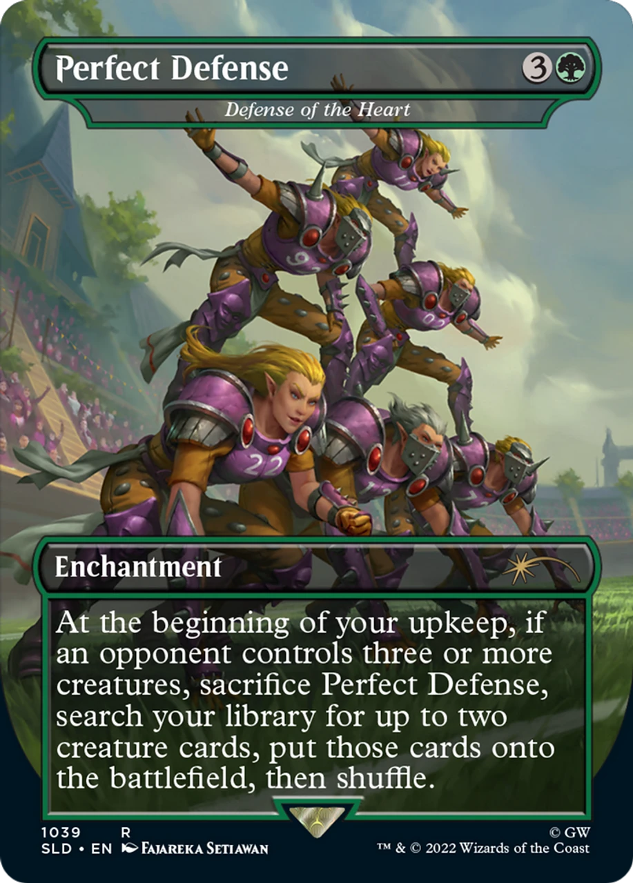 - Text: At the beginning of your upkeep, if an opponent controls three or more creatures, sacrifice Defense of the Heart, search your library for up to two creature cards, put those cards onto the battlefield, then shuffle.