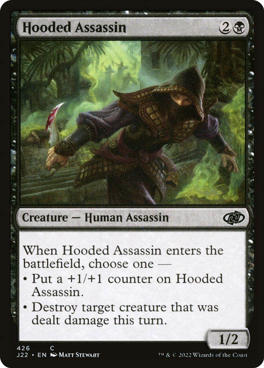 - Text: When Hooded Assassin enters the battlefield, choose one —