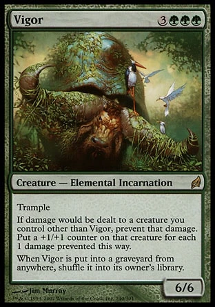 If damage would be dealt to a creature you control other than Vigor, prevent that damage. Put a +1/+1 counter on that creature for each 1 damage prevented this way.