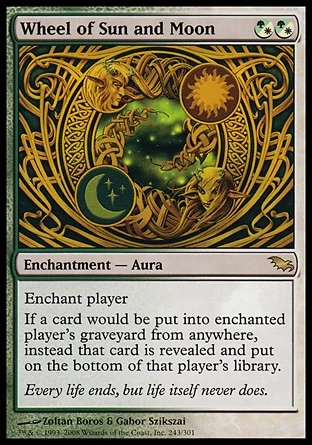 If a card would be put into enchanted player’s graveyard from anywhere, instead that card is revealed and put on the bottom of that player’s library.