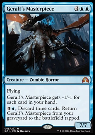 Geralf’s Masterpiece gets -1/-1 for each card in your hand.