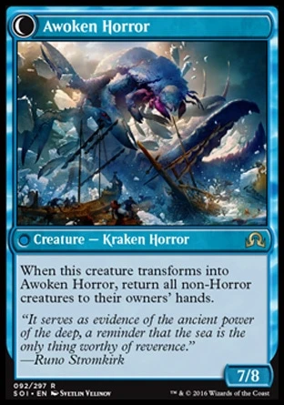 When this creature transforms into Awoken Horror, return all non-Horror creatures to their owners’ hands.