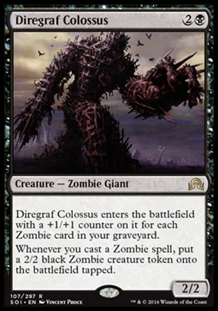 Diregraf Colossus enters the battlefield with a +1/+1 counter on it for each Zombie card in your graveyard.