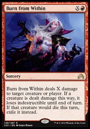 Burn from Within deals X damage to target creature or player. If a creature is dealt damage this way, it loses indestructible until end of turn. If that creature would die this turn, exile it instead.
