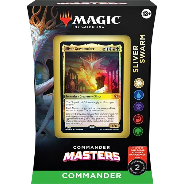 Each Commander Masters Commander Deck set includes 1 ready-to-play deck of 100 Magic cards (2 Traditional Foil Legendary Creature cards, 98 nonfoil cards), a 2-card Collector Booster Sample Pack, 1 foil-etched Display Commander (a thick cardstock copy of the commander card with foil etched into the card’s border and art), 10 double-sided tokens, 1 deck box (can hold 100 sleeved cards), 1 Life Wheel, 1 strategy insert, and 1 reference card.
