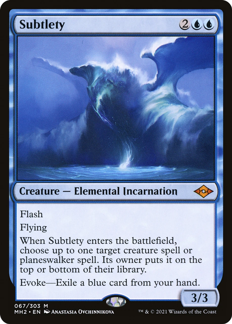 When Subtlety enters the battlefield, choose up to one target creature spell or planeswalker spell. Its owner puts it on the top or bottom of their library.