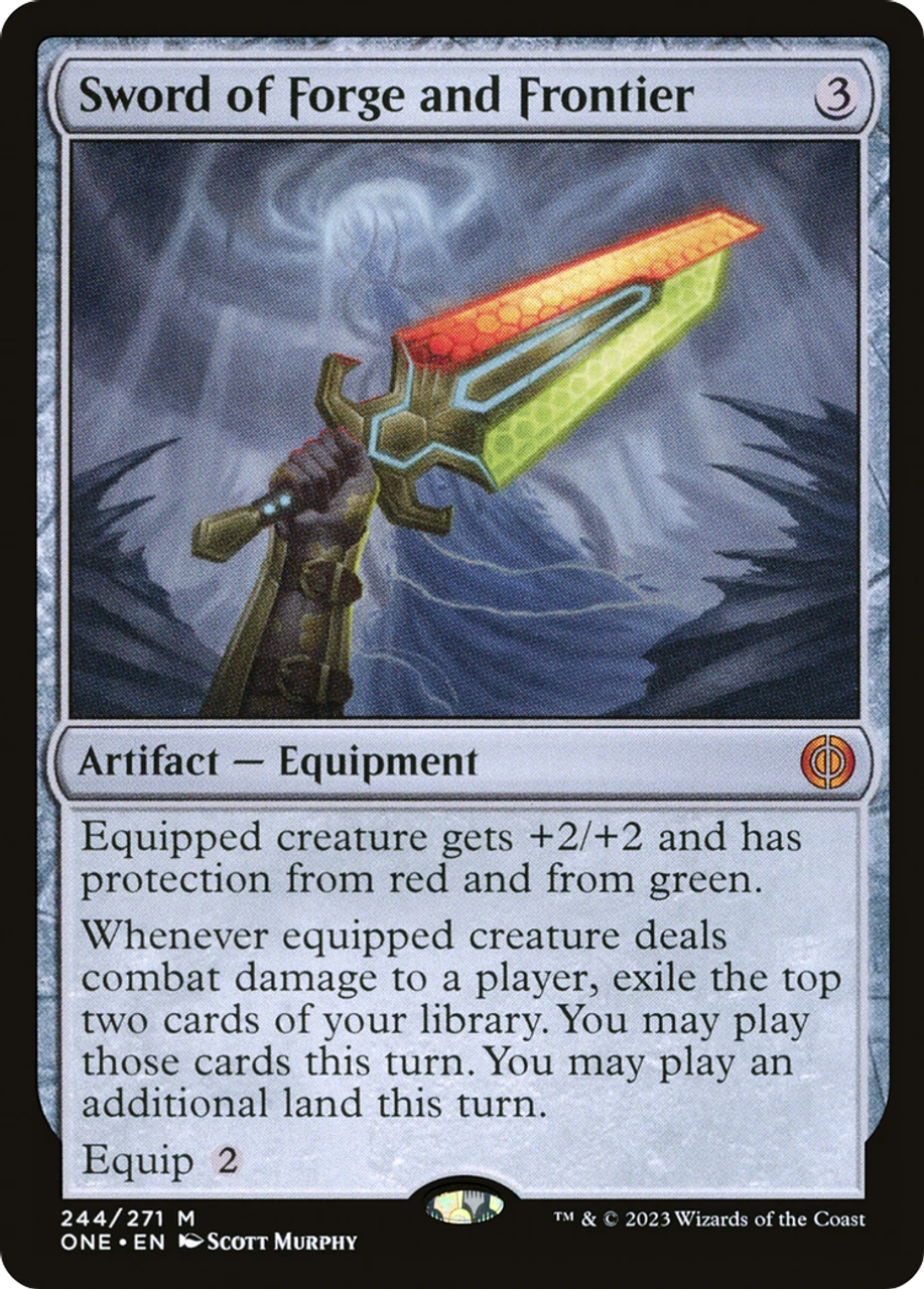 Whenever equipped creature deals combat damage to a player, exile the top two cards of your library. You may play those cards this turn. You may play an additional land this turn.