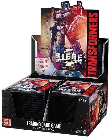 Each War for Cybertron Siege I TCG Booster Pack contains 1 large foil and 1 small foil TRANSFORMERS Character Card and 6 Battle Cards.