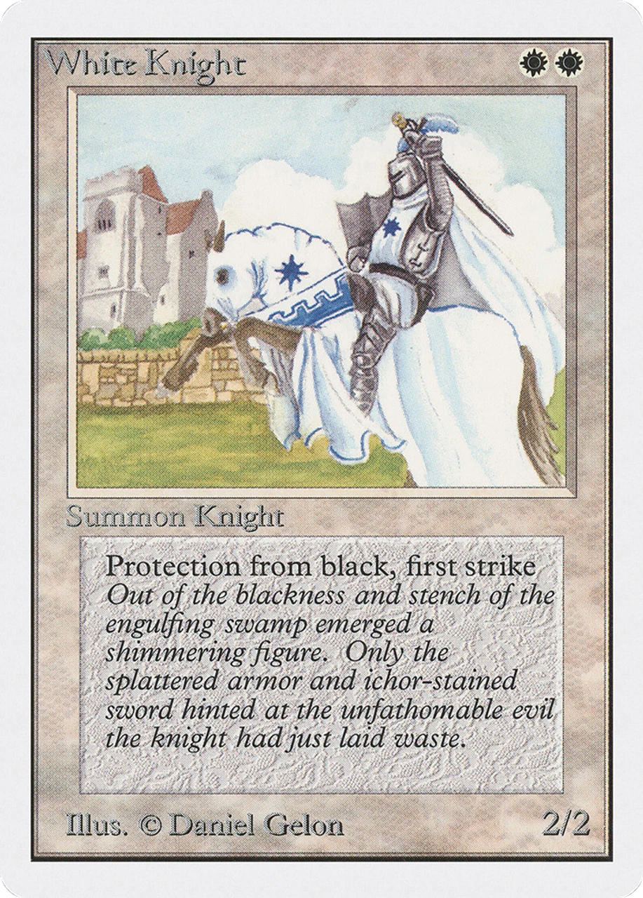 Protection from black (This creature can’t be blocked, targeted, dealt damage, or enchanted by anything black.)