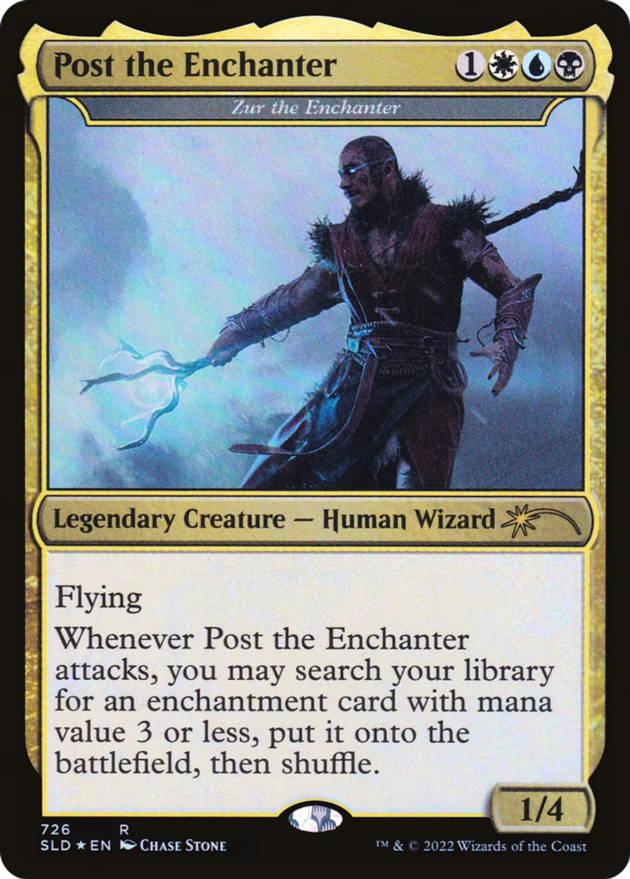 Whenever Zur the Enchanter attacks, you may search your library for an enchantment card with mana value 3 or less, put it onto the battlefield, then shuffle.